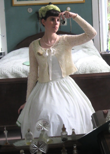 I chose a 50's inspired dress I made quite a few years ago to go with it. It's actually made out of an old bed sheet I saved from the rag pile. It has such cute tiny green polka-dots all over it.